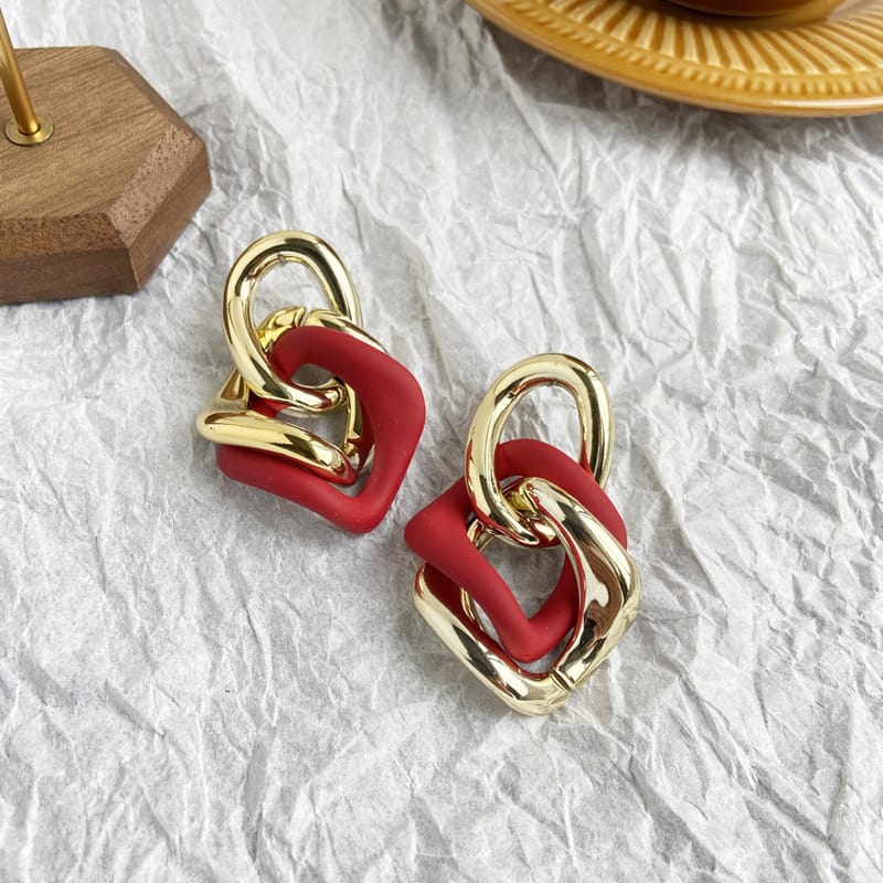 Μοντέρνα Σκουλαρίκια σε σχήμα κρικων αλυσίδας, σε χρώμα κόκκινο και χρυσό, από κραμα ορείχαλκου και πλαστικό, βάρος 10,7 γρ